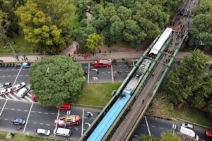 El impacto se produjo a las 10:31 del viernes, en una curva del trayecto de altura -está a unos seis metros del piso- del ramal del San Martín que atraviesa CABA rumbo al conurbano norte. La cifra actualizada de afectados marca 90 heridos, 60 atendidos en el lugar y 31 que debieron ser hospitalizados, entre ellos un maquinista.