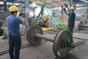 Los obreros realizan tareas de reperfilado de ruedas.