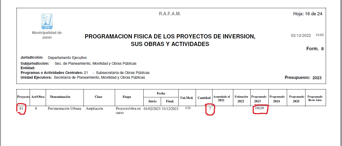 El intendente Petrecca anunció 100 cuadras de pavimento. Para 2023 en el Presupuesto enviado por él mismo y aprobado por el Concejo solo se prevén 7 (siete) cuadras. Así surge del Proyecto 81 de la Programación Física de los Proyectos de Inversión sus Obras y Actividades. El numero 100 (cien) que aparece a continuación en la hoja del RAFAM es solo el porcentaje de ejecución que se pretende en el año corriente. La confusión de Petrecca es total.