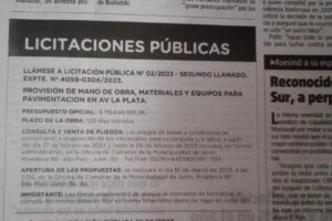 Lo único que se anunció de pavimentación es Avda. La Plata y omitió referirse que son fondos de la Nación. Pero hay dudas con la obra. La primera licitación cayó en febrero. Para el segundo llamado se publicó el edicto este sábado en un medio local. Se puede leer en el mismo que la apertura será el 10 de marzo. Pero consultas de pliegos serán desde el 27 de febrero hasta el …..8 de febrero. ¿Un simple error o una nueva treta para que nadie consulte o compre pliego y para hacer caer la licitación y luego adjudicar de forma directa a algún empresario amigo? Si no se rectifica y se otorgan nuevos y legales plazos, las dudas se agigantan.