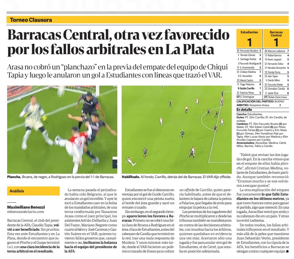 En Clarín también le dedicaron un espacio en su tapa. Y dentro de la edición del Suplemento Deportivo titularon: “Barracas Central, otra vez favorecido por fallos arbitrales en La Plata”, señalando que “Arasa no cobró un ‘planchazo’ en la previa del empate” y también ponderando el offside imposible de hallar en el trazado de líneas.