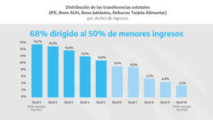 A su vez, la creación del IFE, que puso el foco en los sectores más vulnerables ante el aislamiento social, preventivo y obligatorio dispuesto para frenar la propagación del virus, contribuyó a ampliar la cobertura estatal mediante transferencias monetarias hasta alcanzar al 89% del decil más pobre de la población.