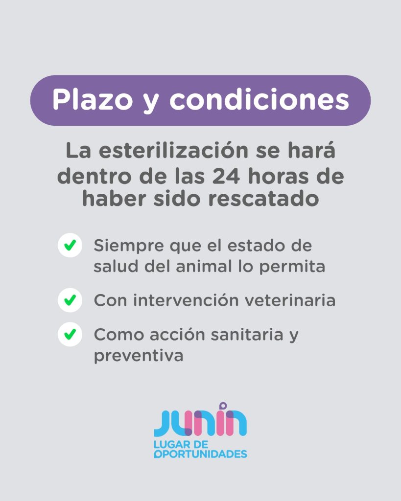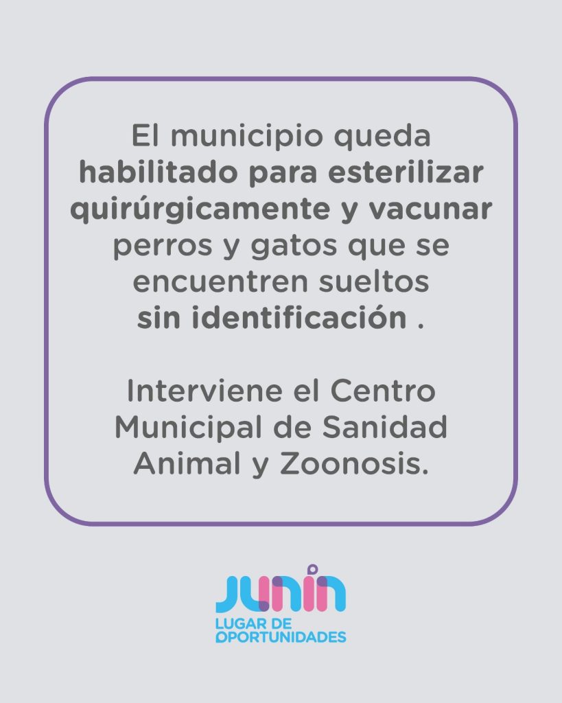 Desde la Dirección de Zoonosis del municipio de Junín informaron que se procederá al rescate, castración y vacunación antirrábica de felinos y caninos que se hallen en las calles sin identificación. “El objetivo es que haya menos gatos y perros en la vía pública, y promover la tenencia responsable de mascotas”, afirmó la doctora Agustina Cacheiro.