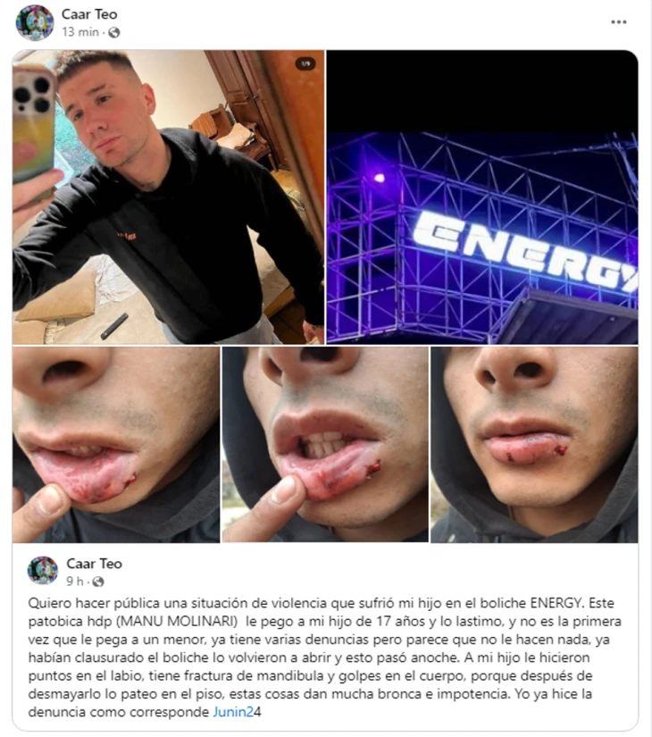 “Quiero hacer pública una situación de violencia que sufrió mi hijo en el boliche ENERGY. Este patovica hdp (MANU MOLINARI) le pegó a mi hijo de 17 años y lo lastimó, y no es la primera vez que le pega a un menor, ya tiene varias denuncias pero parece que no le hacen nada, ya habían clausurado el boliche lo volvieron a abrir y esto pasó anoche. A mi hijo le hicieron puntos en el labio, tiene fractura de mandíbula y golpes en el cuerpo, porque después de desmayarlo lo pateó en el piso, estas cosas dan mucha bronca e impotencia. Yo ya hice la denuncia como corresponde”, publicó César Teo en su cuenta de Facebook.