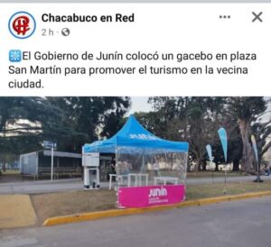 “Veo en el portal Chacabuco en Red que el Gobierno de Junín promueve el turismo de la ciudad con un gacebo, tres gotitas flamables y tres mesas… juro que no es fake.