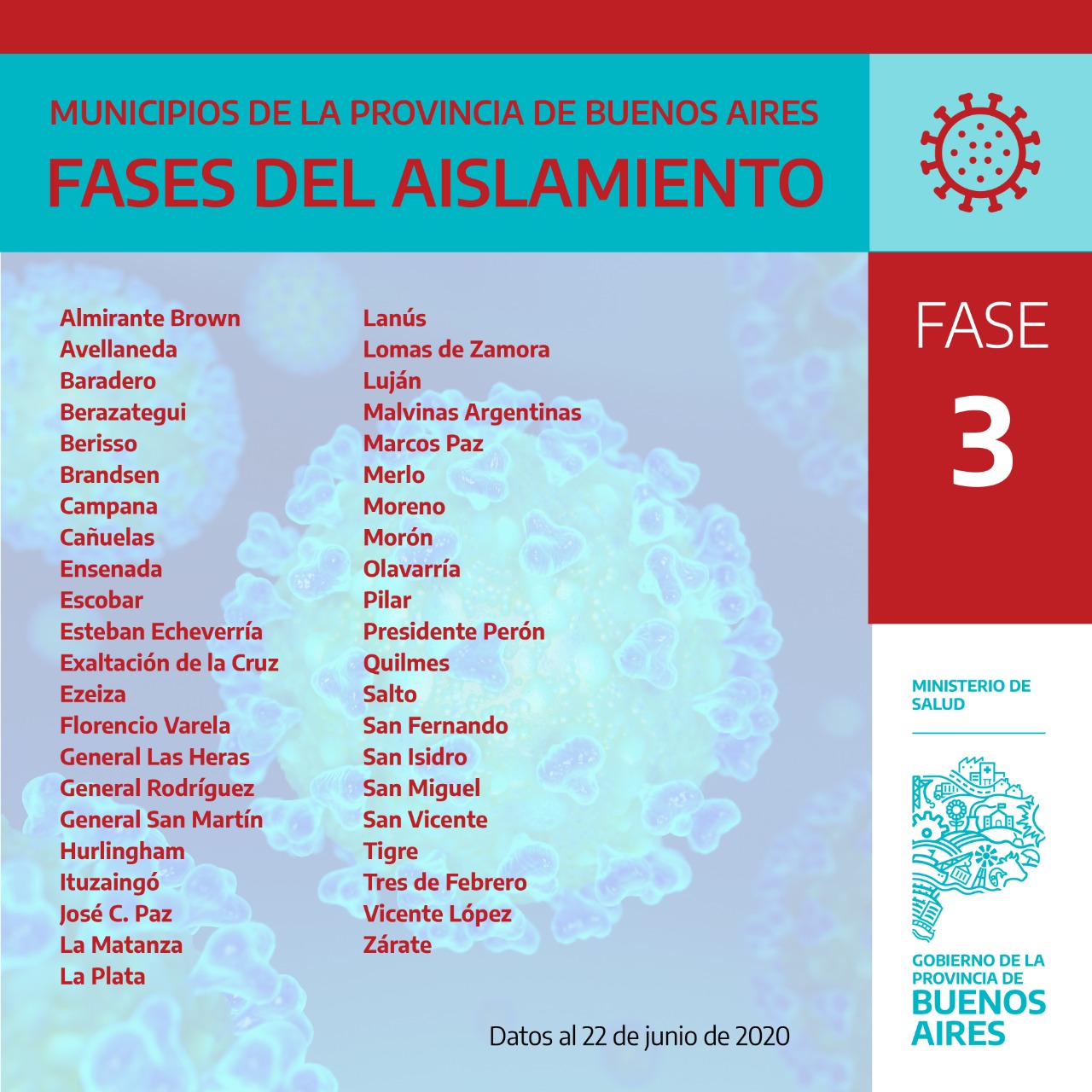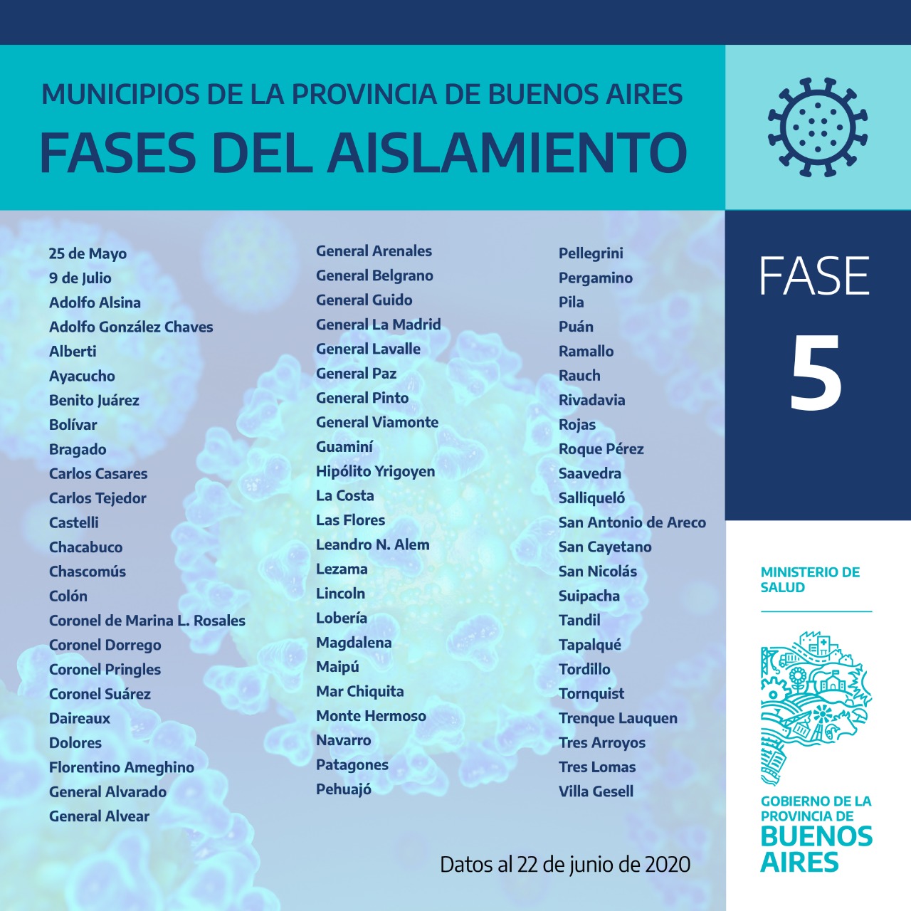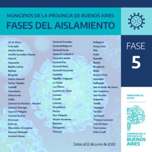 HomeSin categoría¿En qué fase está cada Municipio de la Provincia de Buenos Aires? Sin categoría ¿En qué fase está cada Municipio de la Provincia de Buenos Aires? By AdminSomosRadio 22/06/2020 0 51 Te mostramos en qué fase se encuentra cada uno de los 135 Municipios de la Provincia de Buenos Aires, Junín se encuentra en fase 4. Si no se conoce ningún caso positivo de Coronavirus, el 1 de Julio nuestra ciudad ingresaría en Fase 5. Compártelo: Click to share on WhatsApp (Se abre en una ventana nueva) WhatsApp Hacé click para compartir en Facebook (Se abre en una ventana nueva) Facebook Click to email a link to a friend (Se abre en una ventana nueva) Correo electrónico Click to share on X (Se abre en una ventana nueva) X Previous articleResultado Fiscal – Sector Público Nacional – Mayo 2020Next articleEL FRENTE DE TODOS LOGRÓ APROBAR DOS PROYECTOS EN LA ÚLTIMA SESIÓN ARTICULOS RELACIONADOS Sin categoría La informalidad laboral en Argentina alcanzó el 43,2%., expuso el abogado Dr Ignacio Iudica 02/10/2025 Sin categoría Iudica: La devaluación actual disminuye el salario en dólares de los trabajadores argentinos un 25%. 25/09/2025 Sin categoría Tres niños muertos y varios heridos en el incendio de una vivienda 29/06/2025 MAS POPULARES Gimnasia venció a Sarmiento en un partido clave por la permanencia 04/10/2025 Incidentes durante la visita de Javier Milei en Santa Fe: hubo detenidos y se suspendió la caminata del Presidente 04/10/2025 «Queremos seguir construyendo ciencia en Argentina» 04/10/2025 Cientos de juninenses participan de la 51° Peregrinación a Luján 2025 04/10/2025 Load more