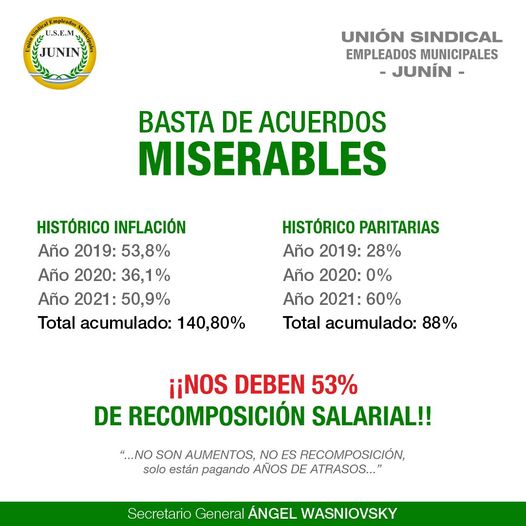 “Manifestamos nuestro absoluto repudio a tamaña barbaridad”, dijo el dirigente del otro sector sindical, que recordó además el pedido de participar de la mesa negociadora. “Solicitamos expresamente al Departamento Ejecutivo la convocatoria e inclusión a las Paritarias 2022; apresuradamente y con el fin de que U.S.E.M.J. no conozca los pormenores de las nefastas negociaciones entre el Ejecutivo y el sindicato de calle Colón conducido por Gabriel Saudán, cerraron en acuerdo, sin consultar las opiniones del trabajador/a municipal, y ó ”, remarcó Wasniovsky.