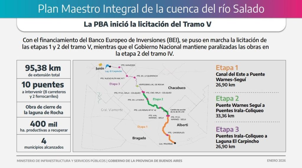 “La licitación comprende las etapas 1 y 2 del Tramo V, que se extiende desde Bragado hasta aguas abajo de la laguna de Rocha, con una longitud de 60,26 kilómetros, atravesando los municipios de Alberti, Bragado y Chacabuco. Además de las obras sobre el cauce del río, el proyecto incluye infraestructura complementaria, como la reconstrucción de siete puentes”, explicó la legisladora.