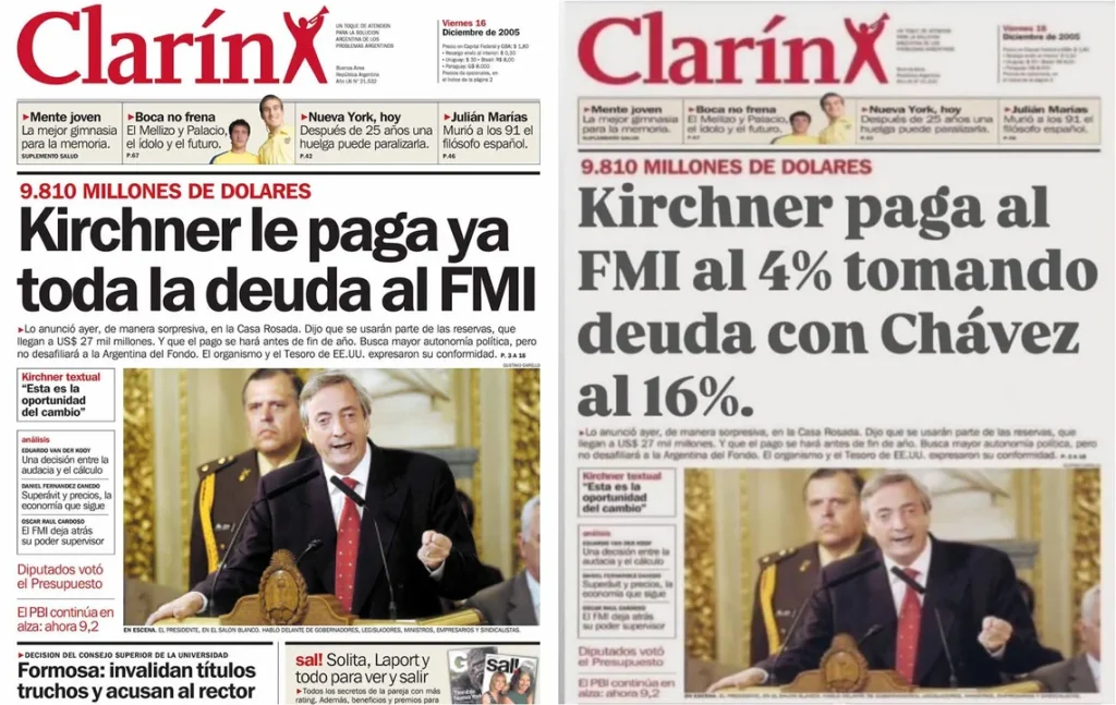 Javier Milei y Alejandro Fargosi postearon en las redes una tapa fake de Clarín de diciembre de 2005 que sostiene que Néstor Kirchner le pagó la deuda al Fondo Monetario Internacional tomando deuda con Venezuela a un interés del 16%.