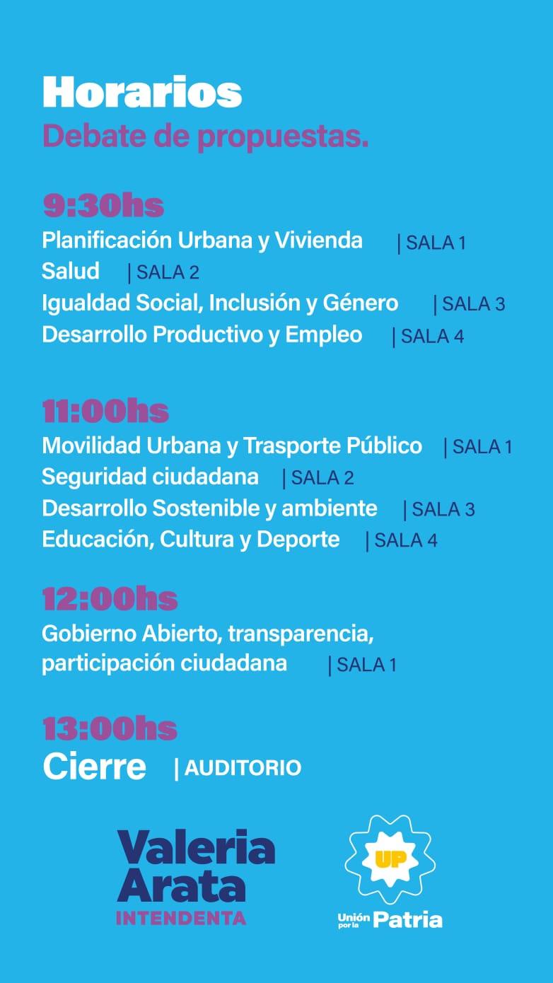 En este marco, Arata indicó que “se armaron comisiones por temas: Planificación urbana y vivienda; Salud; Igualdad Social, Inclusión y Género; Desarrollo Productivo y Empleo; Movilidad Urbana y Transporte Público; Seguridad Ciudadana; Desarrollo Sostenible y ambiente; Educación, Cultura y Deportes; Gobierno Abierto, Transparencia y participación ciudadana. Cada comisión será coordinada por un referente y al finalizar la jornada haremos una presentación en el lugar de las conclusiones a las que llegamos”.