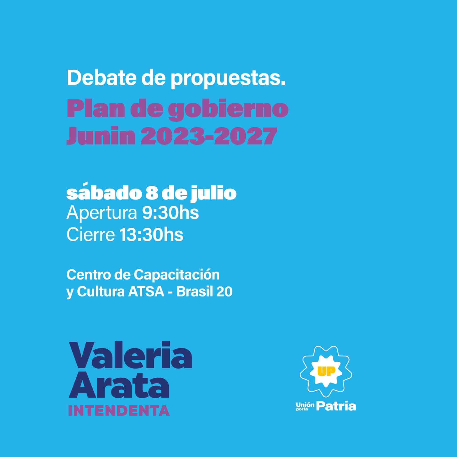 La candidata a intendente por Unión por la Patria, Valeria Arata, invitó a la comunidad de Junín a participar de la jornada de debate de ideas y propuestas para la ciudad que se realizará en el Centro de Capacitación y Cultura de ATSA, ubicado en calle Brasil 20.